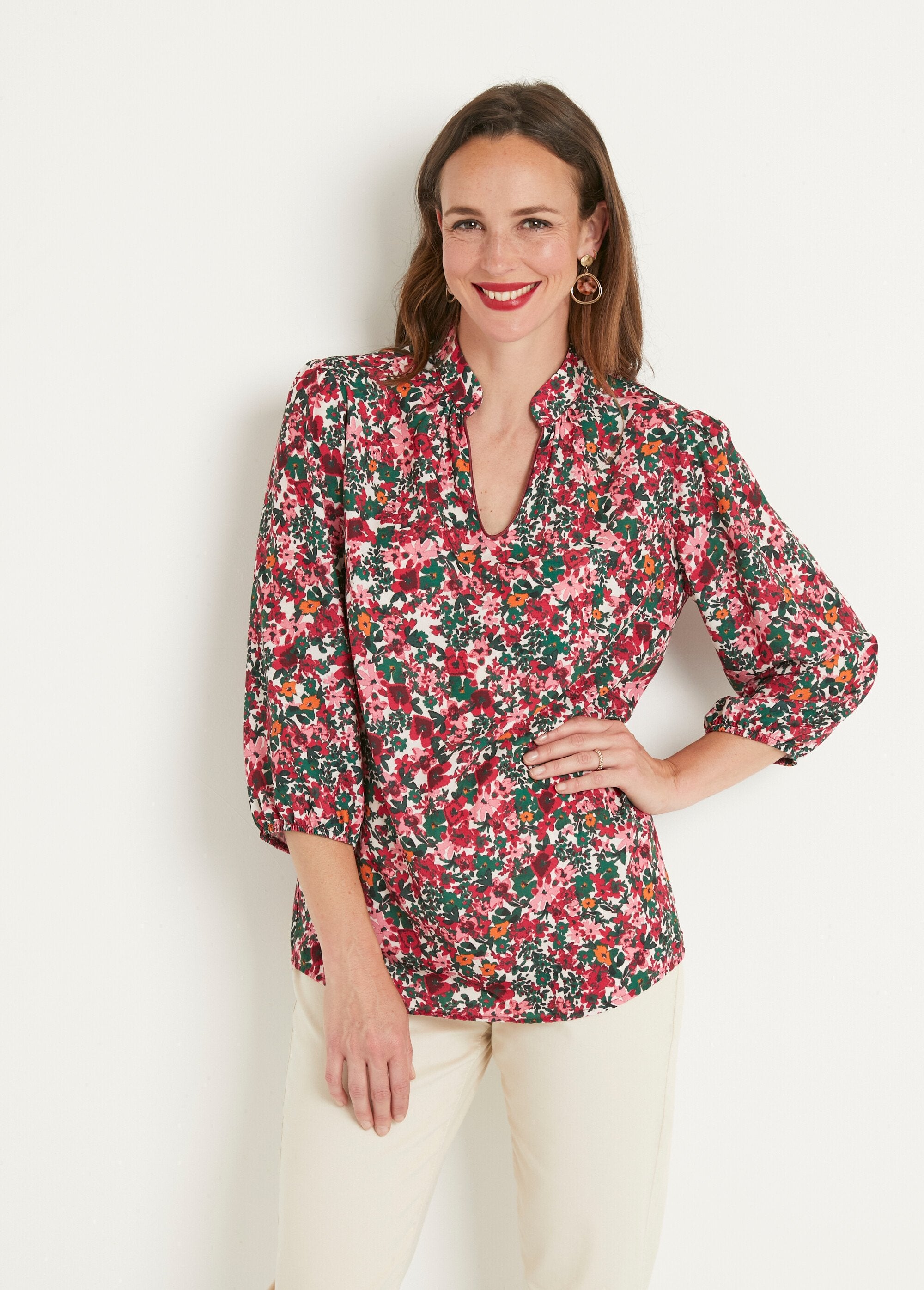 3/4_sleeve_tunic_with_chrysanthemum_pattern_Ecru_and_pink_FA1_slim 3/4_sleeve_tunic_with_chrysanthemum_pattern_Ecru_and_pink_DO1_slim