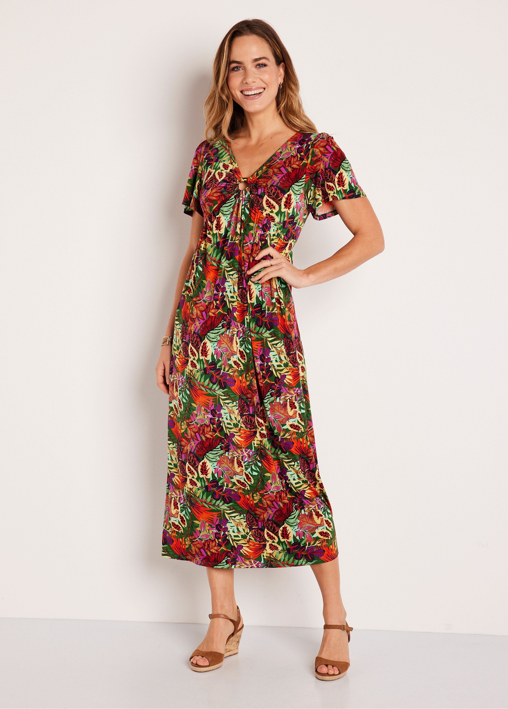 A straight shape that flares nicely below the neckline. A plant-inspired print combined with jewel detail to set the tone. The women's dress plays skin-deep seduction in small and large size fashion. She shows her preference for high heels and when it's a little cool, a plain cardigan chosen in the tones of her print.